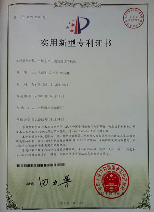 平板車牽引架高度調(diào)節(jié)機構(gòu)專利證書